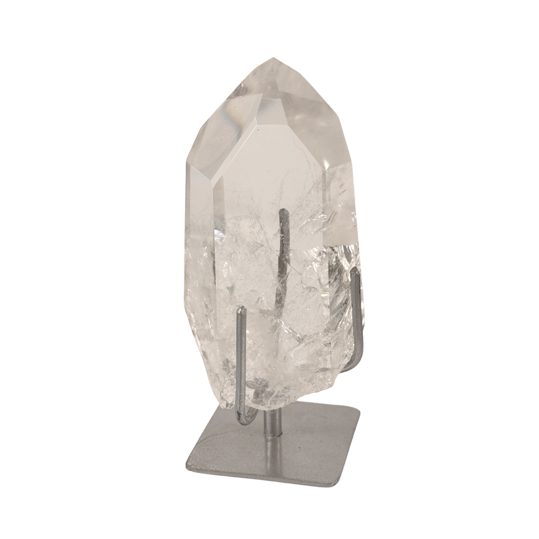 A naturally clear quartz point displayed on a modern stand, prized for its brilliant clarity and timeless presence. Clear quartz is known as the “master healer,” believed to amplify energy, enhance focus, and promote balance, making it both a striking decorative piece and a meaningful crystal for intentional spaces.