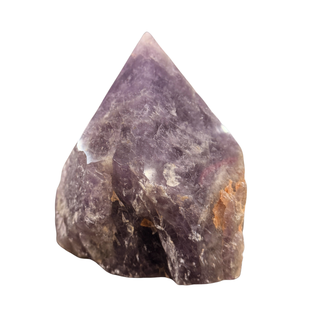A natural amethyst point featuring deeper purple tones with a richly textured interior and raw base. The polished peak highlights the crystal’s internal structure, while the rugged lower section preserves its organic formation. Associated with calm, clarity, and protection, this piece offers both visual depth and natural character.
