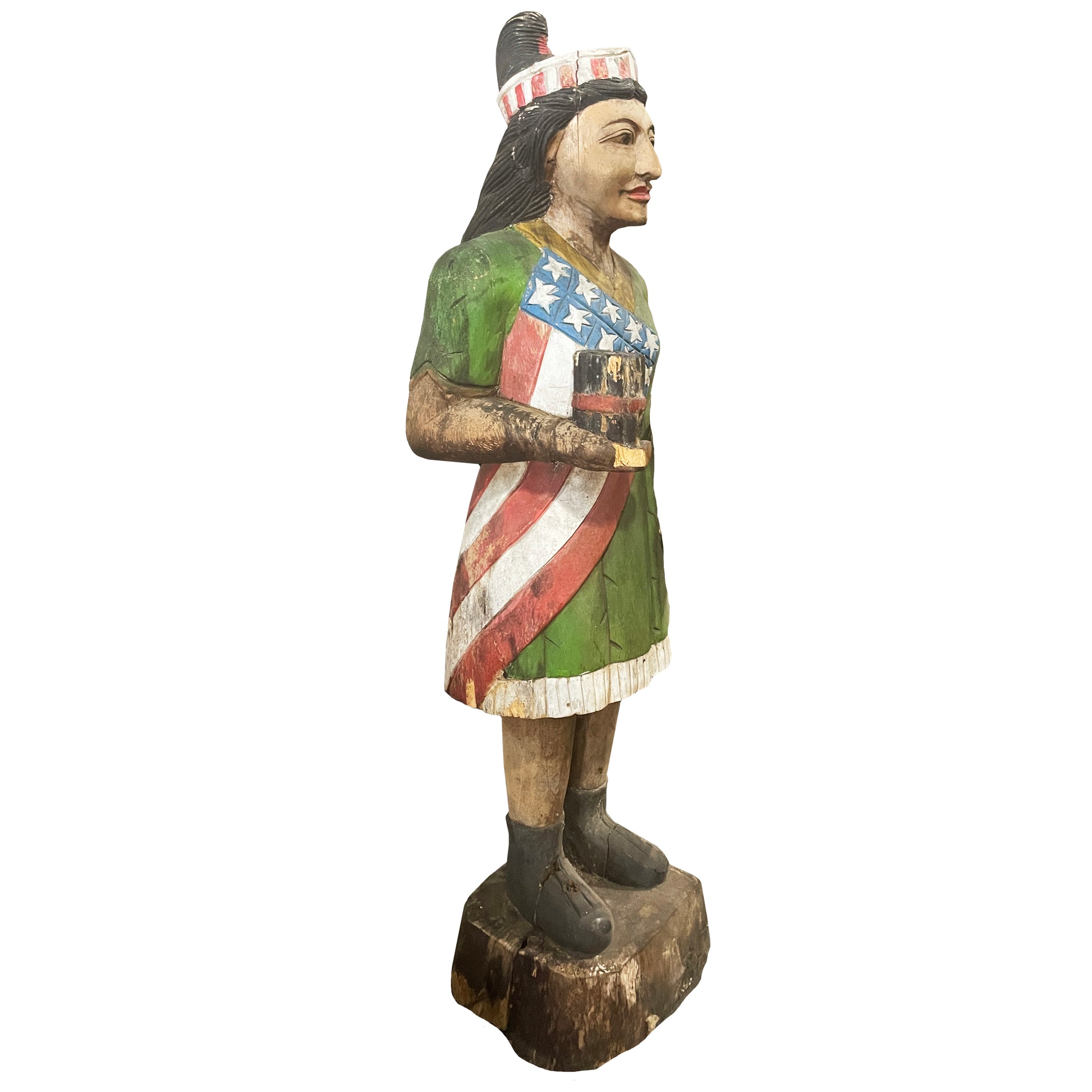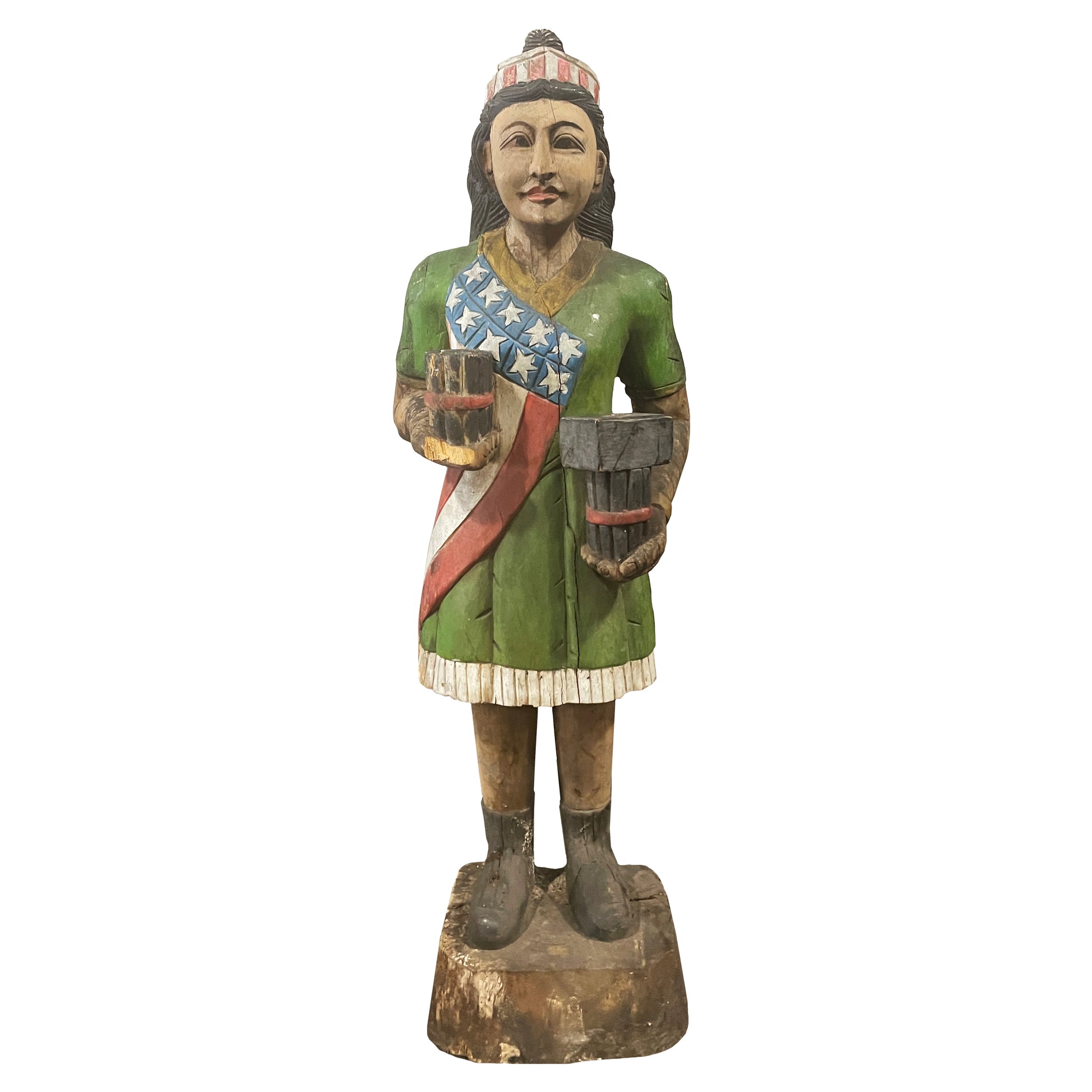 This handcrafted wooden statue depicts Lady Liberty dressed in vibrant colors and holding barrels, blending iconic American symbolism with rustic craftsmanship. The detailed carving and patriotic attire make this statue stand out for any Americana-themed décor. Perfect for collectors or as a bold statement piece, this statue adds a touch of history and patriotism to your space.