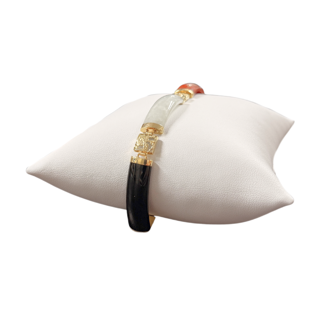 This elegant bracelet blends the natural beauty of multiple gemstones into one timeless design. Featuring polished green jade, luminous white jade, striking black onyx, and earthy red jasper, each stone segment is delicately framed with gold-toned accents. A symbol of harmony and strength, this bracelet highlights the vibrant diversity of nature’s treasures, making it a versatile accessory for both daily wear and special occasions.