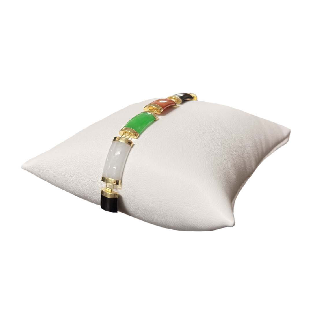 This elegant bracelet features a striking combination of green jade, lavender jade, yellow jade, red jasper, white jade, and black onyx, set in polished gold-tone links. Each stone represents harmony, strength, and balance, making this piece not only a stylish accessory but also a meaningful symbol of protection and positive energy.