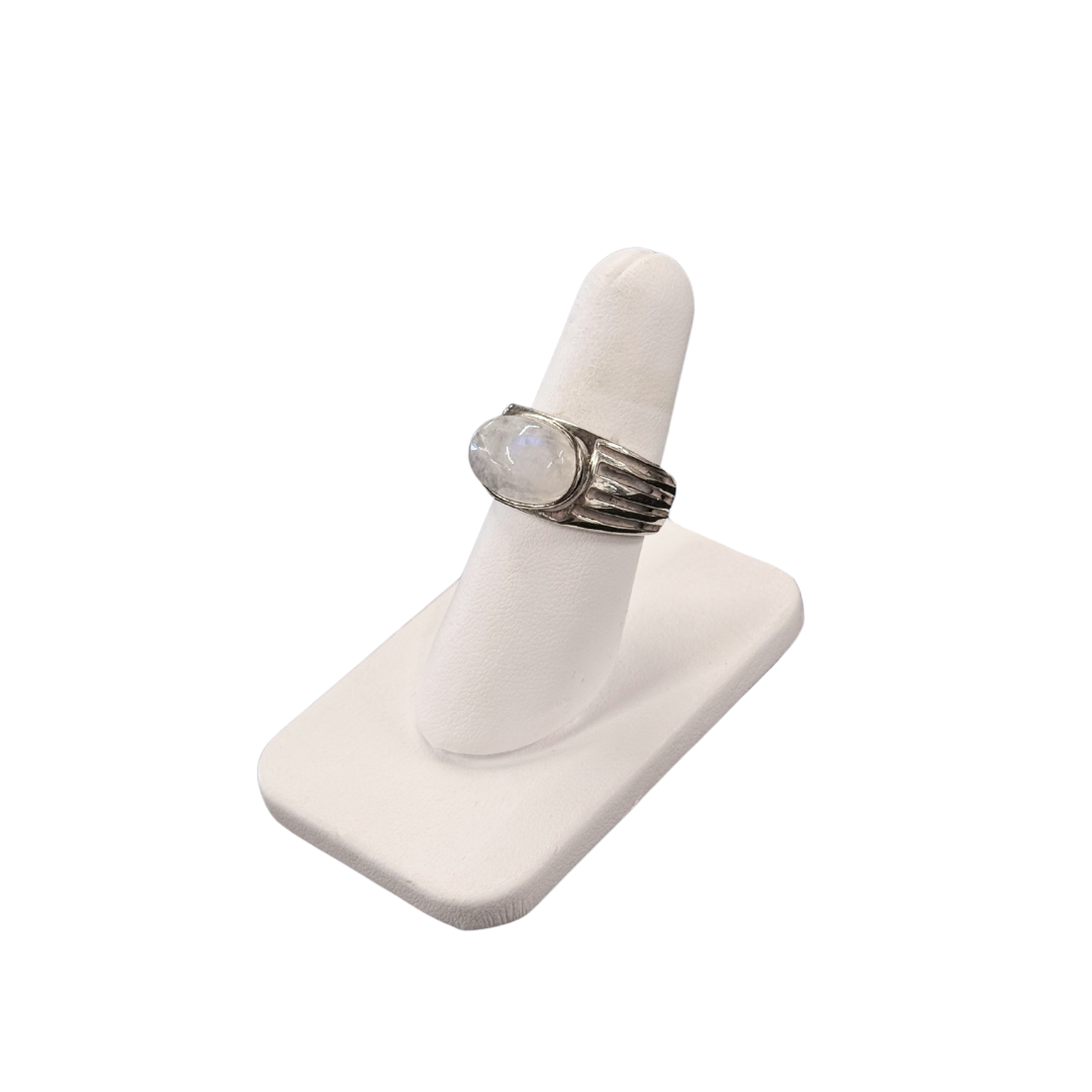 This Oval Natural Moonstone Ring features a polished cabochon set in a silver-plated ribbed band, combining texture with a soft, luminous glow. Moonstone is admired for its subtle shimmer and its association with balance, intuition, and calm energy.