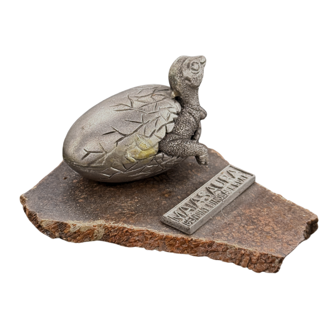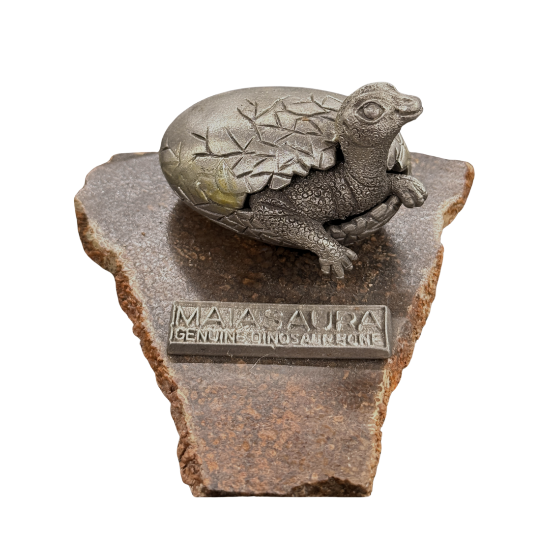 This piece is a pewter sculpture of a baby Maiasaura dinosaur hatching from its egg. The sculpture sits on a base made from real dinosaur bone, millions of years old.