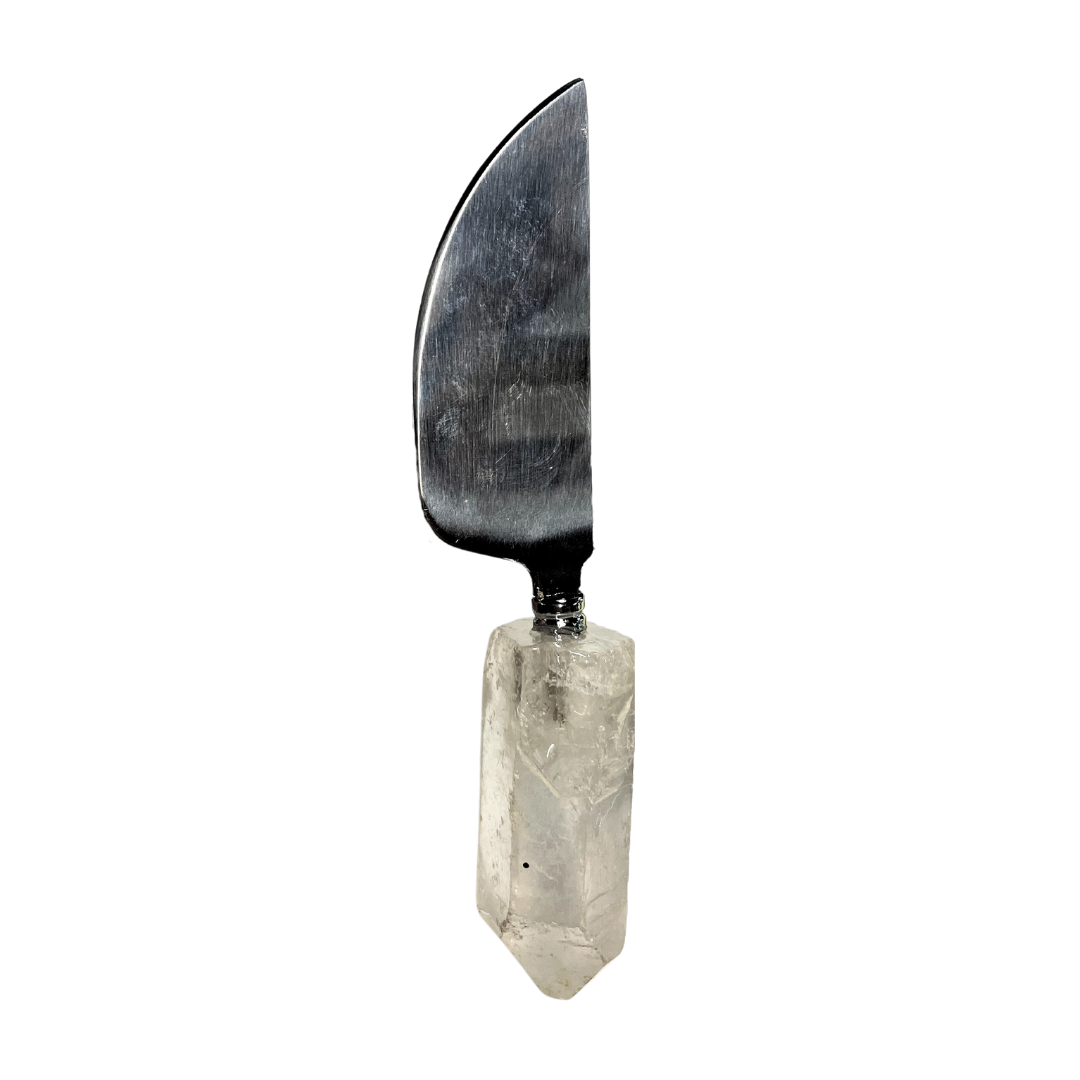 Slice with sophistication using our elegant quartz crystal knife. The handle is meticulously crafted from clear quartz, known for its purity and energy properties, attached to a sleek stainless steel blade. This luxurious knife is not only a practical kitchen tool but also a striking piece of décor, perfect for dinner parties and special events.