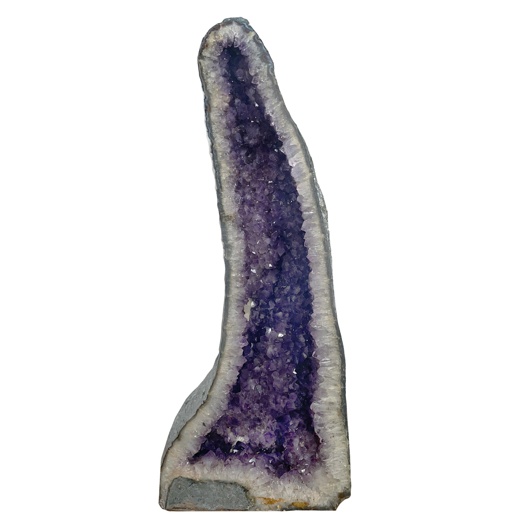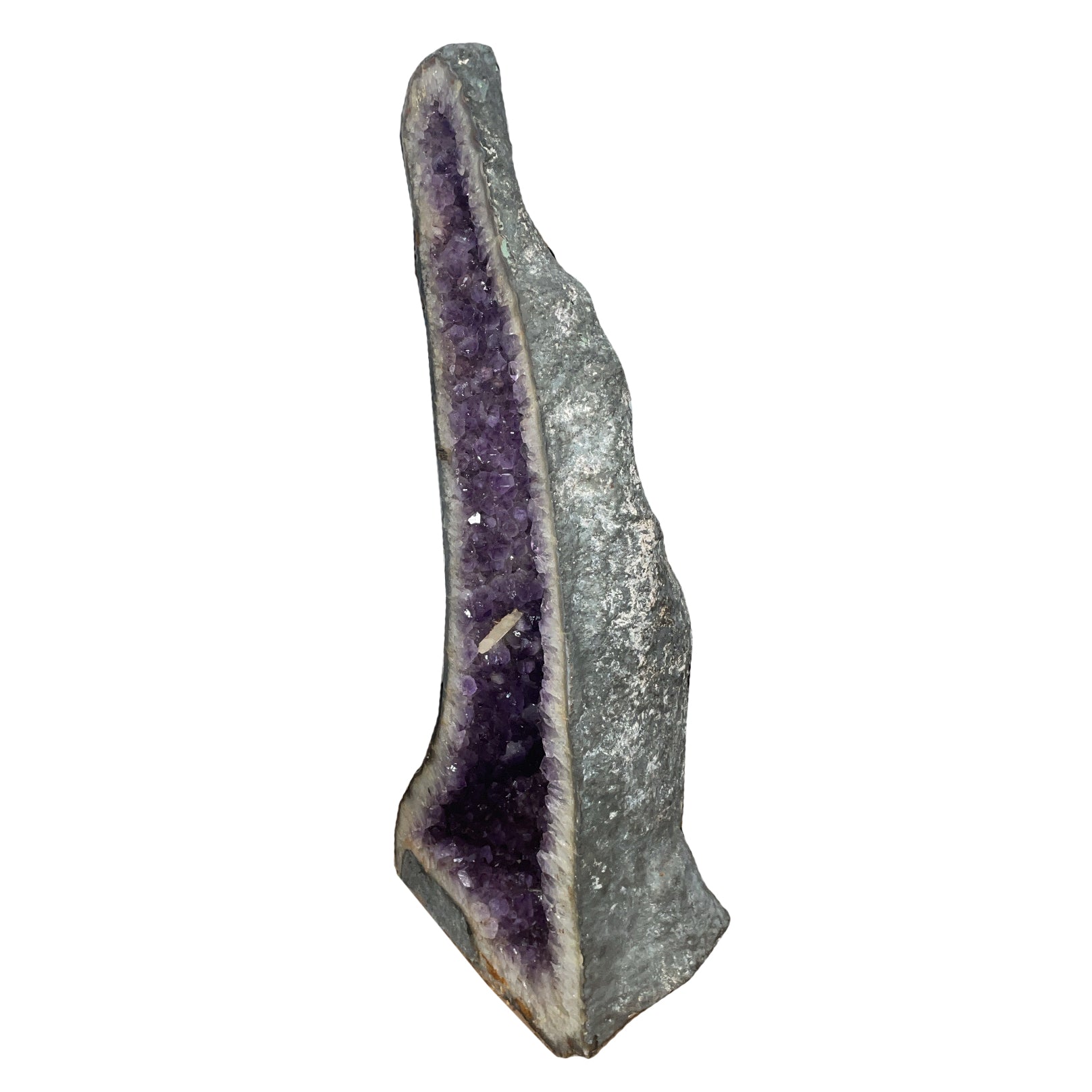 This amethyst geode with calcite inclusion enhances its visual appeal and natural healing properties. Amethyst geodes relieve stress and promote tranquility in home décor.